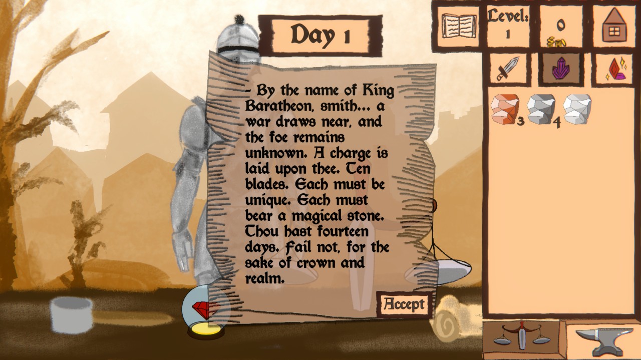 You are a novice blacksmith, just beginning to master the art of forging blades in your mobile forge on wheels. Craft unique swords, trade with merchants, travel across the world, and rise to become the greatest smith of all time.