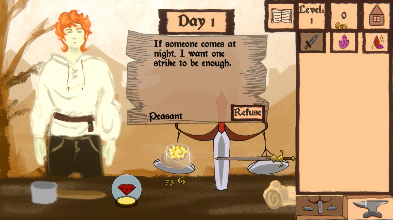 In this game, you will bargain with customers, forge your own weapons, and purchase materials from wandering traders. Improve your skills, refine your craft, and learn to understand what each client truly needs.